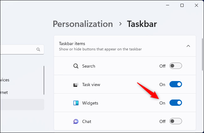 Tất nhiên bạn cũng có thể dễ dàng vô hiệu hóa widget thời tiết này từ cửa sổ cài đặt thanh tác vụ — chỉ cần chuyển tùy chọn Widget thành “Off”. Cửa sổ này cũng cho phép bạn bật và tắt các biểu tượng thanh tác vụ khác, bao gồm Search, Task View, hay Chat.
